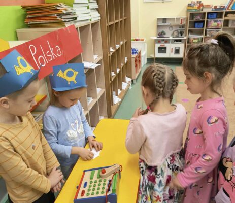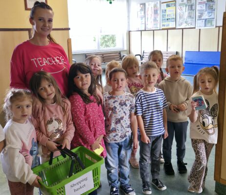 W ramach zajęć z języka angielskiego grupa sześciolatków wybrała się na zakupy do szkolnego sklepiku....